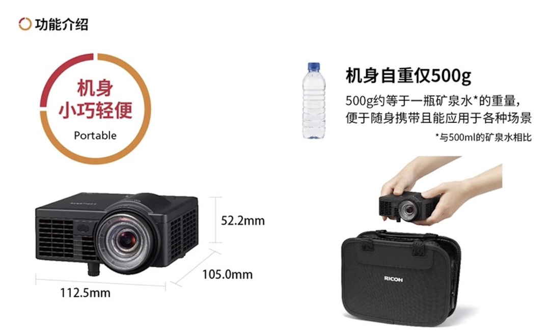 恰是一口氣解決了這四大難題,理光嶄新的PJRW1120EST投影機(jī),才會(huì)有海報(bào)剛出就引起行業(yè)強(qiáng)烈反響:LED光源,長壽命、速開機(jī);800流明標(biāo)準(zhǔn)亮度,結(jié)合LED顯色優(yōu)勢百英寸大屏無壓力;0.8:1短焦投射比乃是全球LED投影首創(chuàng),1.55米就能打出100英寸大屏——尤其是,這些性能聚集一身,PJ RW1120EST體重只有500g、三維不過112.5*52.2*105mm——重量等于一瓶礦泉水、體積只在手掌上!