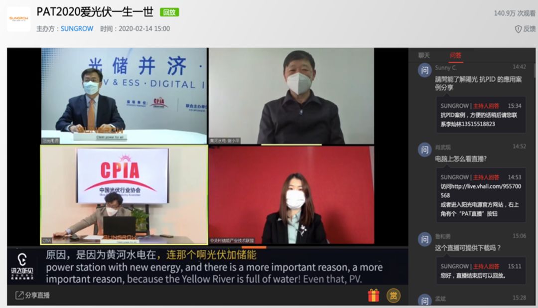 本屆PAT2020,陽光電源與微吼合作,開創(chuàng)了中國光伏技術(shù)研討暨新品發(fā)布“純線上會議”形式,兩小時在線觀看人次超過140萬,評論互動數(shù)萬條。由此,陽光電源的這次直播也被網(wǎng)友稱之為光伏界“李佳琦”的誕生。