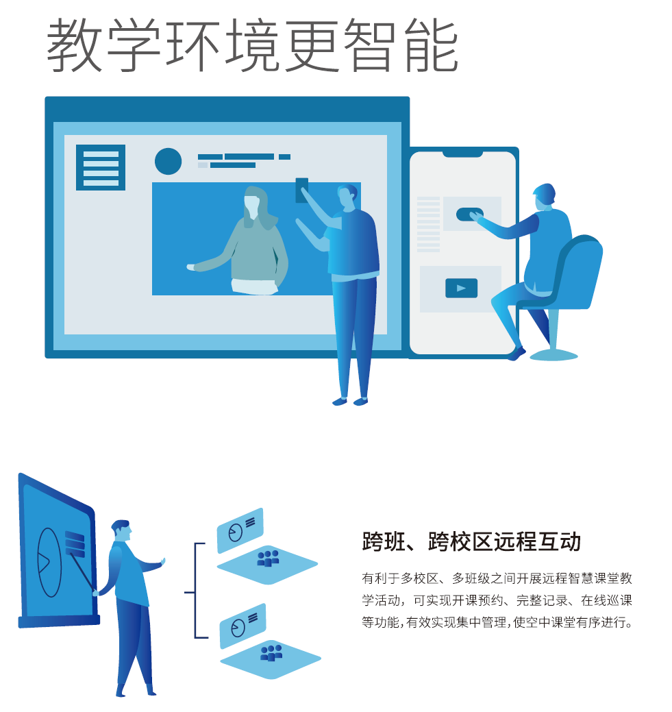 互動(dòng)型智慧教室將學(xué)生、講師和演講者凝聚在一起,打造出動(dòng)態(tài)的工作組環(huán)境。通過(guò)分享每一個(gè)人的多媒體演示內(nèi)容,讓團(tuán)隊(duì)成員、講師和演講者可以更深入的交流,相互協(xié)作。如果需要,甚至可以將遠(yuǎn)程參與者納入討論當(dāng)中。