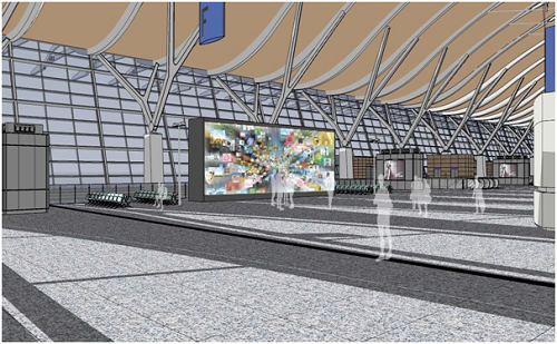在設(shè)計上,上邊框和左右邊框都設(shè)計成98mm,下邊框考慮到放置互動傳感設(shè)備的需求設(shè)計成了500mm,在尺寸設(shè)計上完全滿足客戶的要求,并兼顧整體 的美觀性。此外,表面安裝了攝像頭,體感設(shè)備,紅外傳感器,音響出音孔 和聚光燈光等。同時,表面材料選用鋁扣板材質(zhì),美觀大方,和機場環(huán)境色 調(diào)保持高度一致,并且易于拆除,充分考慮客戶將來進行結(jié)構(gòu)上的調(diào)整和擴 展需求。