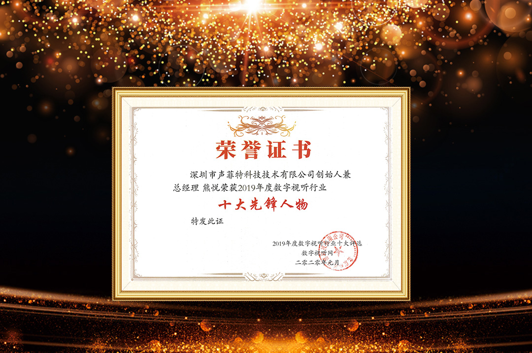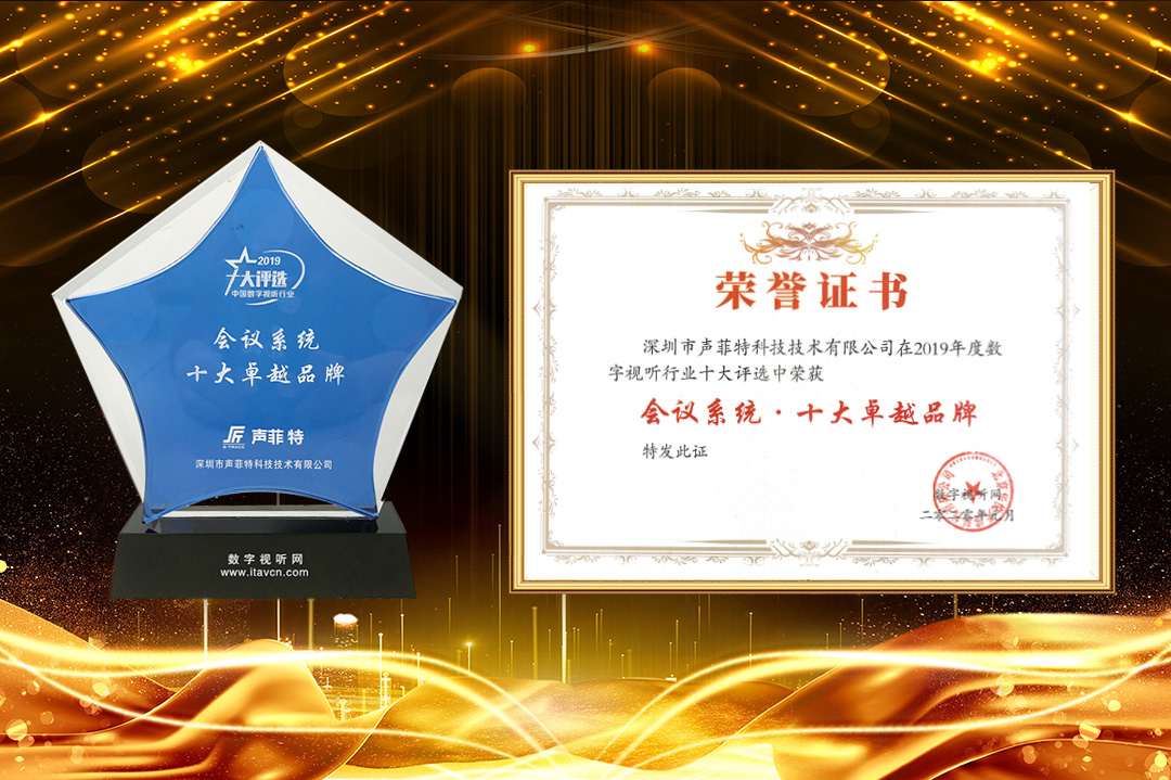 2019年度中國數(shù)字視聽行業(yè)年度十大評選活動,由中國數(shù)字視聽網(wǎng)主辦,多位業(yè)內(nèi)權(quán)威專家參與。經(jīng)過五個環(huán)節(jié)(自主報名、篩選入圍、網(wǎng)上投票、專家評定、公布結(jié)果),聲菲特憑借在業(yè)內(nèi)廣泛的影響力,最終獲得高票,并得到業(yè)內(nèi)專家的一致認(rèn)可。