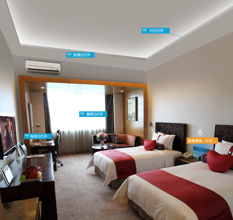從開房門那一刻,柔和燈光亮起、背景音樂(lè)響起、電視機(jī)、空調(diào)等自動(dòng)開啟、窗簾自動(dòng)關(guān)閉或者打開,如果要睡覺了就一鍵開啟睡眠模式后執(zhí)行所有關(guān)閉語(yǔ)音指令,以上等等都是好家聲智能酒店系統(tǒng)簡(jiǎn)單便捷的體現(xiàn)!