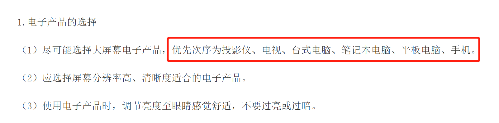 日前,國家衛(wèi)生健康委發(fā)布了《兒童青少年新冠肺炎疫情期間近視預(yù)防指引》,對電子產(chǎn)品的選擇優(yōu)先次序做出了規(guī)范,《指引》指出:“盡可能選擇大屏幕電子產(chǎn)品,優(yōu)先次序為投影儀、電視、臺式電腦、筆記本電腦、平板電腦、手機。”