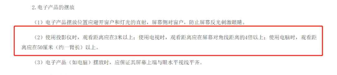 國家衛(wèi)生健康委發(fā)布的《指引》顯示“使用投影儀時,觀看距離應(yīng)在3米以上;使用電視時,觀看距離應(yīng)在屏幕對角線距離的4倍以上;使用電腦時,觀看距離應(yīng)在50厘米(約一臂長)以上。”