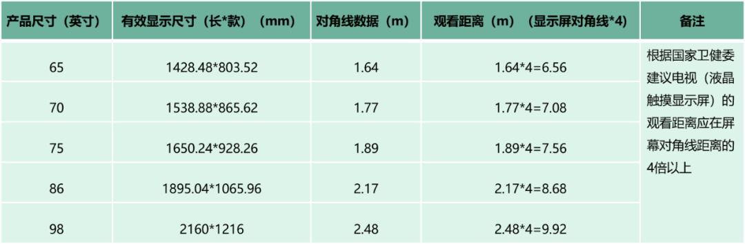 根據(jù)衛(wèi)健委《指引》指示,使用電視時,觀看距離應(yīng)在屏幕對角線距離的4倍以上。由數(shù)據(jù)計算,65英寸電視的要求觀看距離應(yīng)為6.56米;70英寸電視要求觀看距離應(yīng)為7.08米;75英寸電視的要求觀看距離應(yīng)為7.56米;86英寸電視的要求觀看距離應(yīng)為8.68米;98英寸電視的要求觀看距離應(yīng)為9.92米。