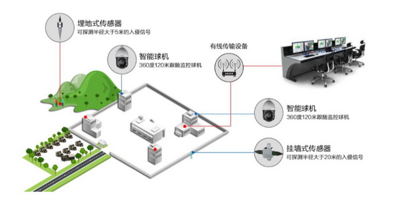 以某部營區(qū)周界預(yù)警系統(tǒng)為例,在營區(qū)圍墻、門崗?fù)鈧?cè)、重要路口埋設(shè)震動傳感器,同時布設(shè)若干智能球機,以可覆蓋營區(qū)周邊區(qū)域和所有死角為原則。而后,利用寬帶電臺或wifi熱點組網(wǎng)。當有人員或動物從圍墻或非入口區(qū)域入侵時,震動傳感器和球機聯(lián)動,將震動和視頻信息傳送至控制中心的預(yù)警平臺,預(yù)警平臺分發(fā)警報信息至應(yīng)急分隊,應(yīng)急分隊根據(jù)突發(fā)情況性質(zhì),派遣處突人員前往處置。