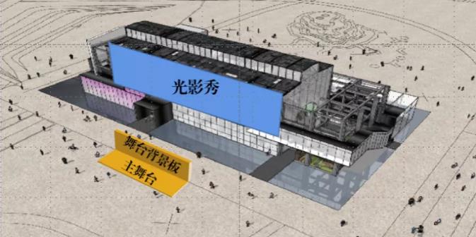 利用前后古今對比打造虛實相生動靜結(jié)合的場景還原演繹及延展性空間觀感體驗,在影片場景與事件的表現(xiàn)上,利用后方是電廠投影幕,前方是現(xiàn)代實景舞臺,讓觀感體驗可以突破空間的限制,將事件與空間相結(jié)合,以虛實相生的情景進(jìn)行歷史還原再現(xiàn),增強(qiáng)互動感,同時能夠激活沙井蠔的文化魅力與活力,通過情節(jié)將沙井蠔的文化特色無線延伸,在視覺空間上也具有更多的延展性。