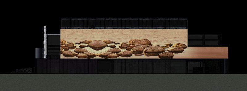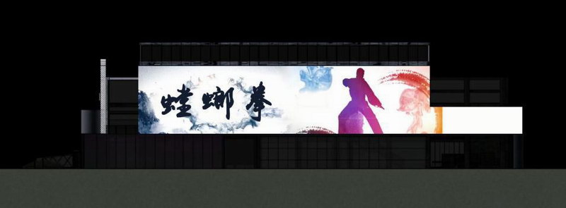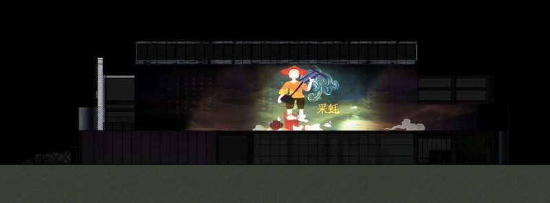 展示方式以立體投影為主,依托蠔鄉(xiāng)湖公園文創(chuàng)展館南側(cè)墻體,在墻體上以三維動畫+二維動畫+實景特效表現(xiàn)。