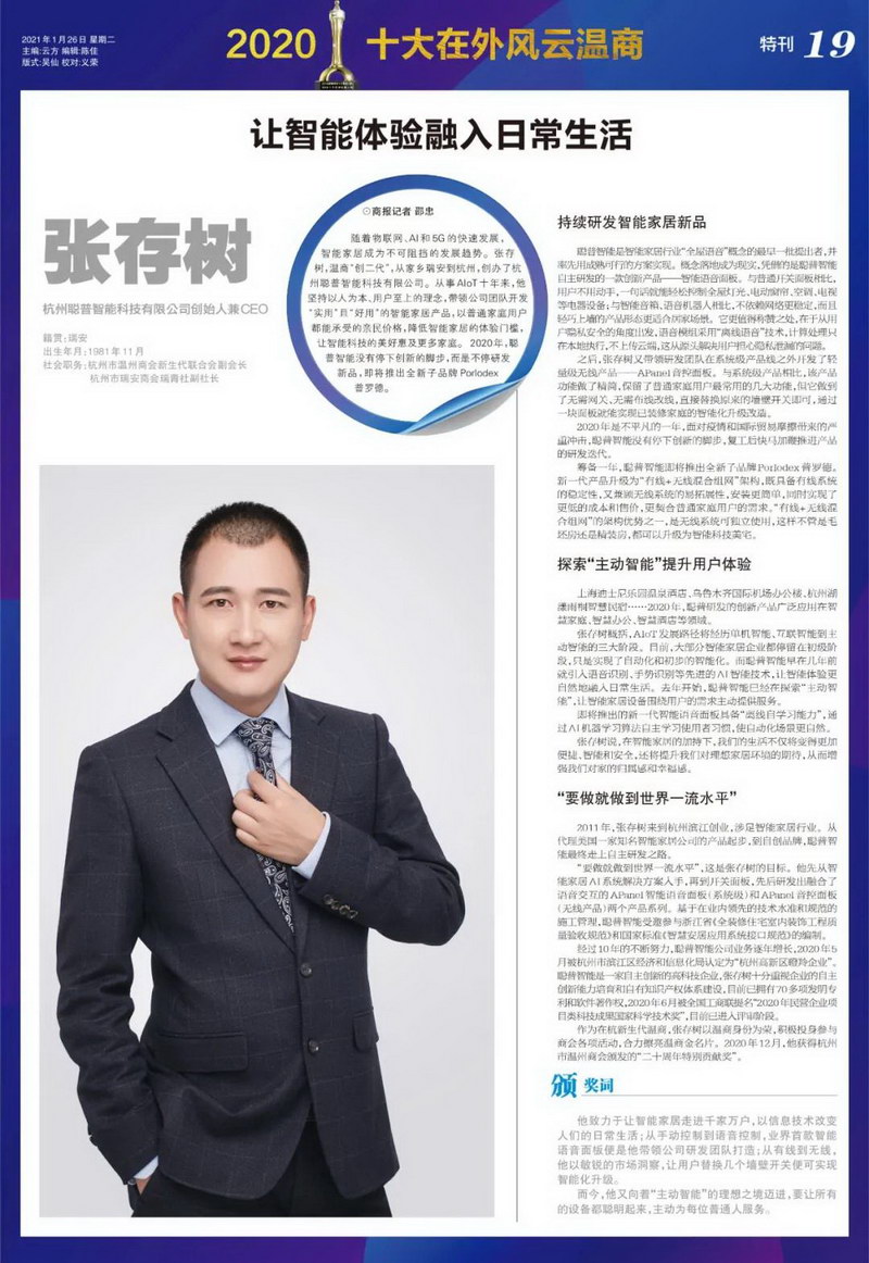 隨著物聯(lián)網(wǎng)、AI和5G的快速發(fā)展,智能家居成為不可抵擋的發(fā)展趨勢(shì)。張存樹,溫商“創(chuàng)二代”,從家鄉(xiāng)瑞安到杭州,創(chuàng)辦了杭州聰普智能科技有限公司。從事AIoT十年來(lái),他堅(jiān)持以人為本、用戶至上的理念,帶領(lǐng)公司團(tuán)隊(duì)開發(fā)“實(shí)用”且“好用”的智能家居產(chǎn)品,以普通家庭用戶都能承受的親民價(jià)格,降低智能家居的體驗(yàn)門檻,讓智能科技的美好惠及更多家庭。2020年,聰普智能沒有停下創(chuàng)新的腳步,在2021年將推出全新子品牌Porlodex(普羅德)。