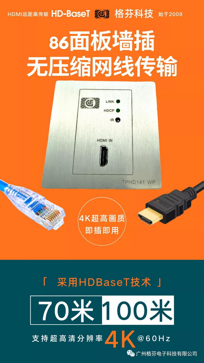 通過Cat6雙絞線,可實現長達70~100米的信號傳輸,遠遠優于目前的HDMI、VGA、Display-Port標準,是較遠距離傳輸上的不二選擇。常見如投影機、電視、混合矩陣、高清播放器等。支持POC/POE功能。, 設有HDMI輸入接口,將接收的HDMI信號轉換為HDBaseT格式,并通過RJ45接口輸出。同時GEFFEN格芬科技GF-TPHD桌插/插墻/地插系列還支持紅外輸入和RS232輸入,可同時將IR信號以及RS232信號與HDBaseT信號一同輸出給接收端。