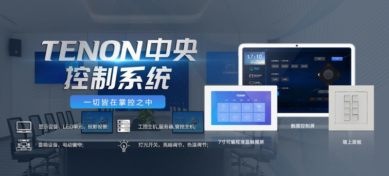 中央控制系統(tǒng)由無線、嵌墻式控制面板,中央控制主機(jī),音視頻信號(hào)切換矩陣、及其周邊的設(shè)備等組成。可通過觸摸屏對(duì)幾乎所有的電氣設(shè)備進(jìn)行控制,包括投影機(jī)吊架和投影屏幕升降、影音設(shè)備、各種信號(hào)切換(如視頻會(huì)議信號(hào)),以及會(huì)場(chǎng)內(nèi)的燈光照明、系統(tǒng)調(diào)光、音量調(diào)節(jié)等。它不僅能控制DVD、錄像的播放、快進(jìn)、快倒、暫停、選曲等功能,而且可以控制投影機(jī)的開關(guān)、信號(hào)的切換,還有白熾燈調(diào)節(jié)、日光燈開關(guān)等等功能﹐免去了復(fù)雜而數(shù)量繁多的遙控器。
