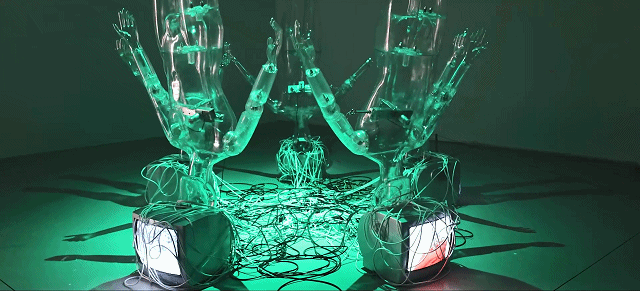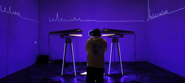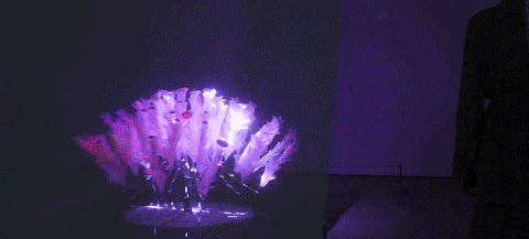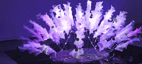 機(jī)械花在觀眾靠近時(shí)便收起綻放的花瓣,被激光掃描而出的虛空間包裹在內(nèi),當(dāng)觀眾離開(kāi)時(shí)悄然綻放從人面對(duì)他人時(shí)自我情緒隱藏的現(xiàn)象出發(fā),內(nèi)在世界無(wú)法完全獨(dú)立于外部世界存在,內(nèi)部世界與外部世界時(shí)刻處在一種動(dòng)態(tài)的“交互與平衡”之中。