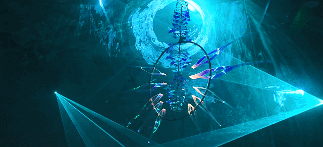 在對(duì)空間的探究中,圍繞“弦理論”對(duì)空間維度的預(yù)言,將我們引入高維的“超空間”遐想。升維的思考或許是反觀的最佳視角,所以我們選擇直面未知的維度。作品《未知·維度》是由20屆畢業(yè)生圍繞未知維度的探討所引發(fā)的十二個(gè)話題,從而生成十二件獨(dú)立綜合媒介空間藝術(shù)作品,并聯(lián)合浙江音樂(lè)學(xué)院畢業(yè)生協(xié)同創(chuàng)作完成。通過(guò)數(shù)字系統(tǒng)控制各部分作品在空間中交替隱現(xiàn),呈現(xiàn)不同話題間整體連貫的詩(shī)性敘事。作品嘗試突破劇場(chǎng)的三維視覺(jué)空間,以沉浸式通感體驗(yàn)呈現(xiàn)超空間的跨維度猜想。
