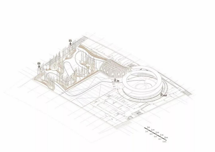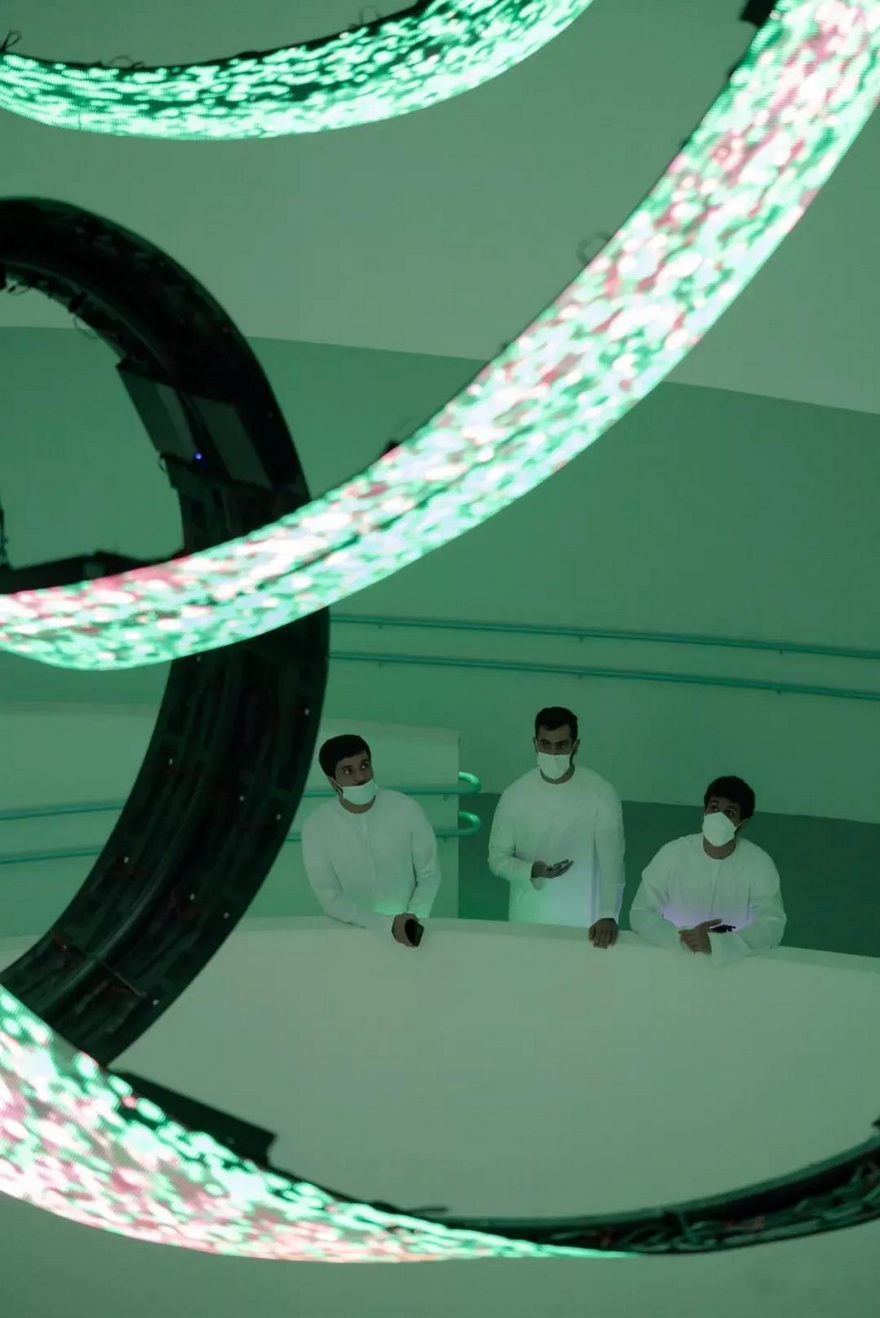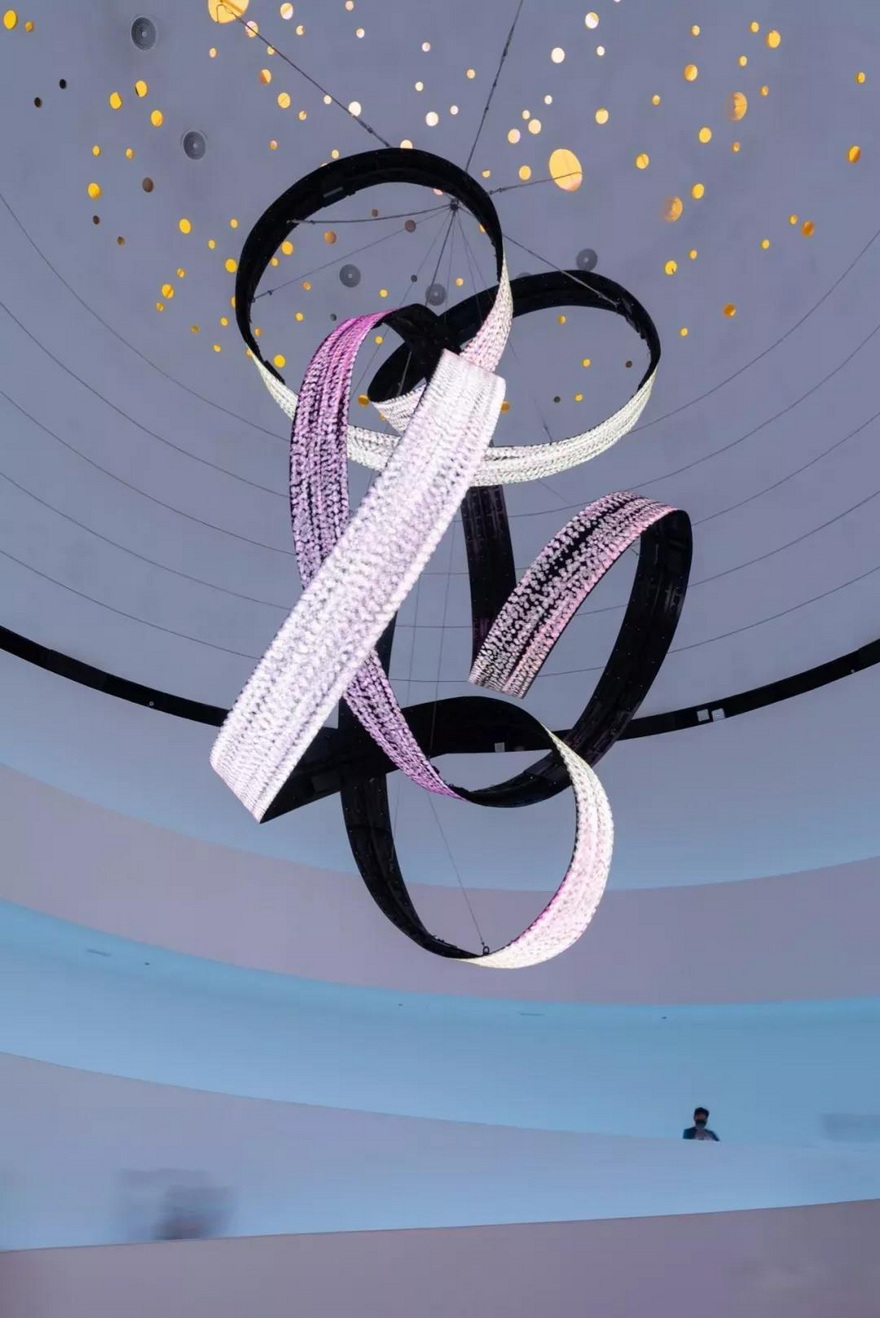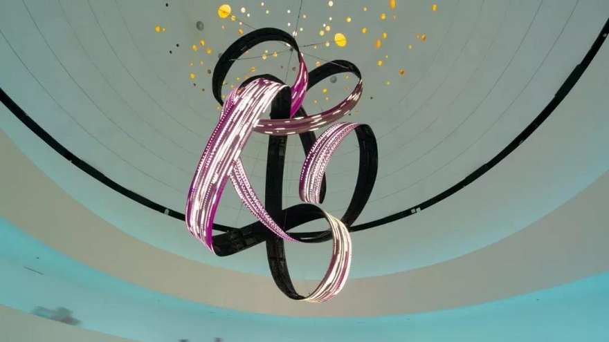 裝置被一條螺旋向下的階梯包圍,由三個LED屏幕組成,形狀像交錯的環(huán)形,通過游客和斜坡上欄桿的互動,產(chǎn)生視聽內(nèi)容。