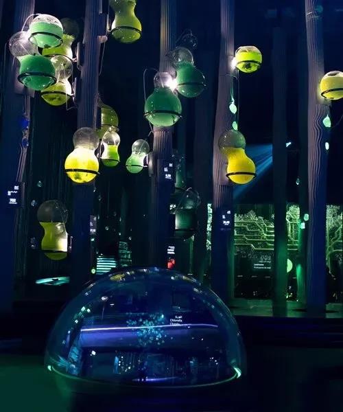 區(qū)中的人造樹木,由可吸收二氧化碳的材料制成,同時還能通過光合作用生產(chǎn)氧氣和食物。原因在于展館設(shè)計的一系列含有螺旋藻和小球藻等微藻的光生物反應(yīng)器。