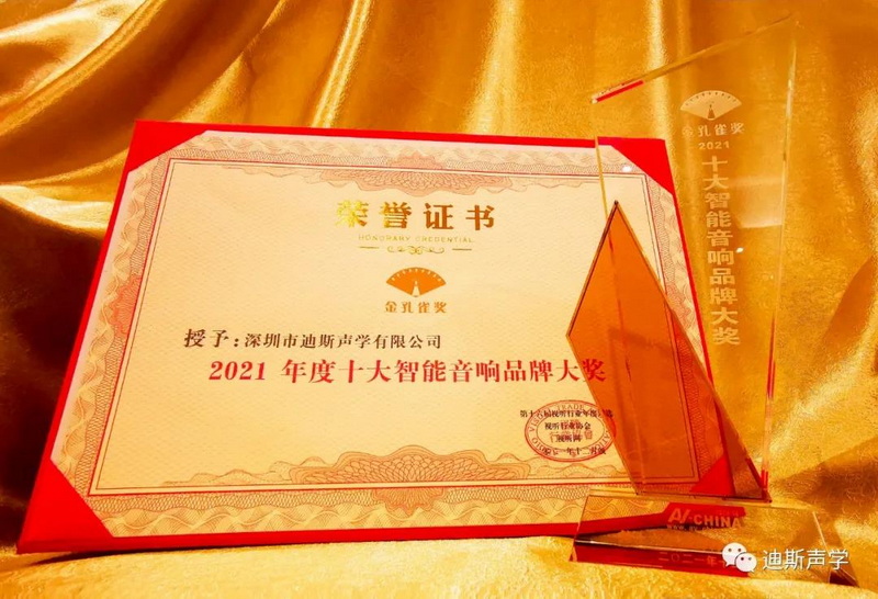 迪斯企業(yè) 文旅事業(yè)部總經(jīng)理龐海波先生上臺領(lǐng)取 金孔雀獎——2021年度十大智能音響品牌大獎!
