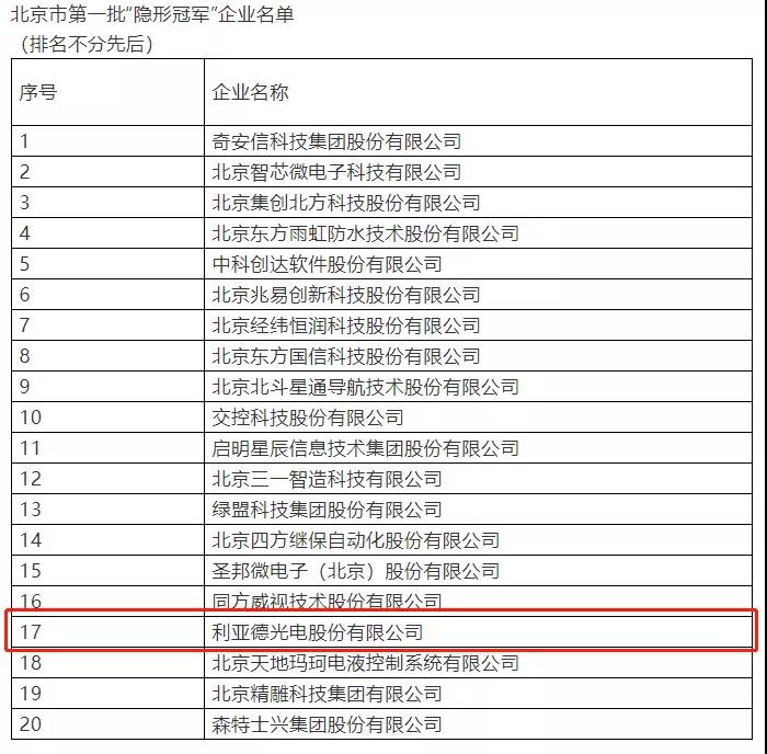 近日,北京市經(jīng)濟(jì)和信息化局、北京市工商業(yè)聯(lián)合會發(fā)布北京市第一批“隱形冠軍”企業(yè)名單,利亞德榜上有名。