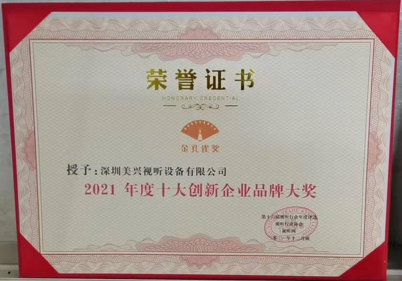 同期經(jīng)過專家組、評(píng)委組、網(wǎng)上投票等多種方式層層篩選,在600家參選企業(yè)中,深圳美興視聽設(shè)備有限公司脫穎而出,榮獲金孔雀獎(jiǎng)——2021年度十大創(chuàng)新企業(yè)品牌大獎(jiǎng)。