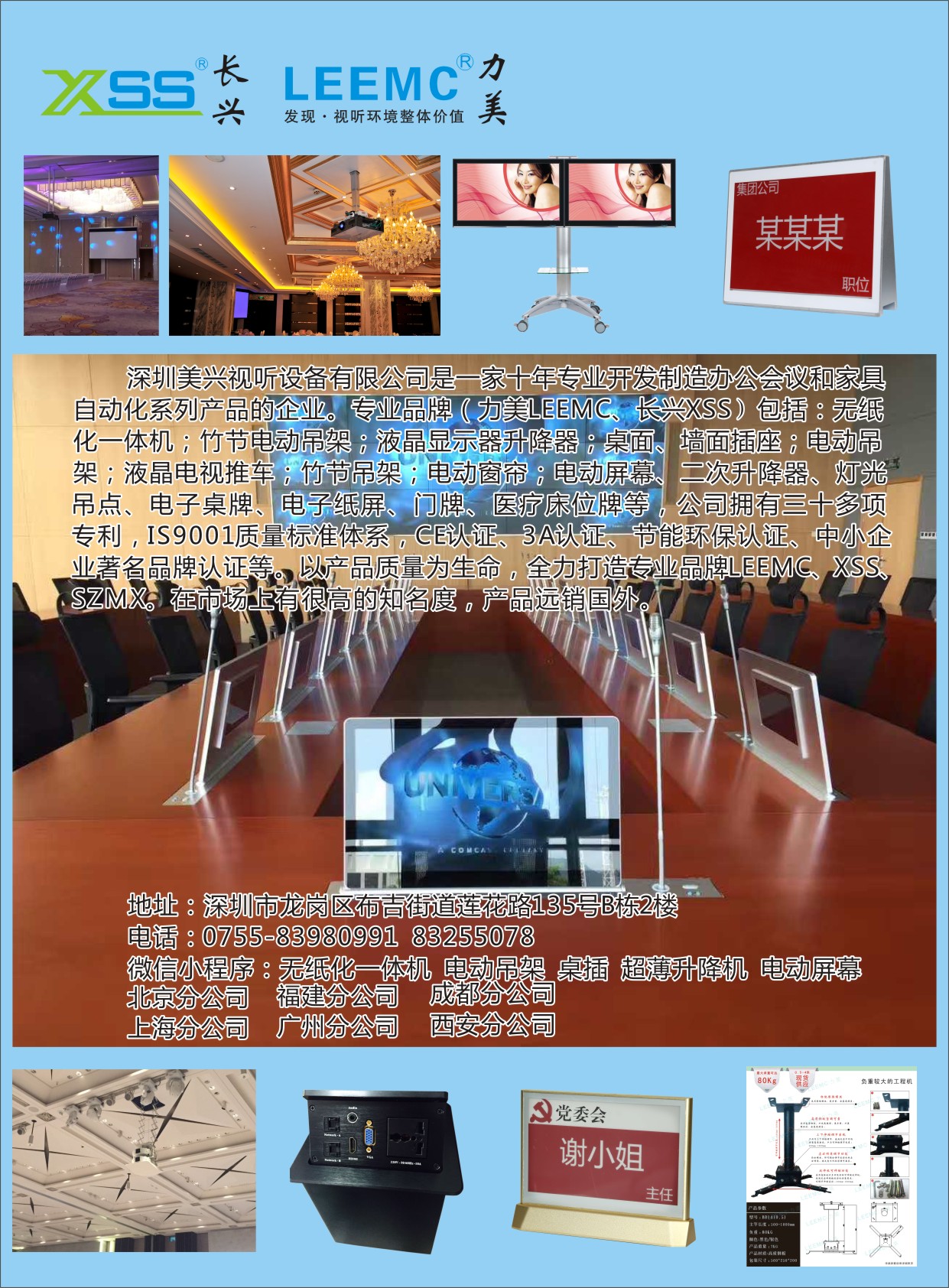 深圳美興視聽設(shè)備有限公司是國內(nèi)專業(yè)開發(fā)、制造視聽設(shè)備的廠商,專業(yè)為會(huì)議室、辦公室、宴會(huì)廳、多功能廳、智能家具等提供燈光影視器材輔助配套系列產(chǎn)品,致力于推進(jìn)智能AI/智能家居自動(dòng)化、辦公自動(dòng)化、會(huì)議自動(dòng)化/無紙化設(shè)備的廣泛應(yīng)用。公司有30項(xiàng)專利、3A認(rèn)證證書、ISO9001、節(jié)能環(huán)保認(rèn)證、CE認(rèn)證、ROHS認(rèn)證等。