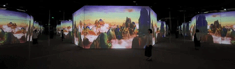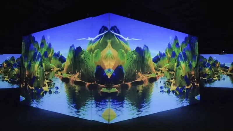 通過傳統(tǒng)藝術的數字活化將江山圖各部分動態(tài)化數字化,分別以古人與今人的視角對作品重新審視與建構。以大觀小、曠觀、神游、浸入式的視覺體驗、散點透視與焦點透視的自由切換,讓觀眾在現代與傳統(tǒng)、科技與藝術之間來回穿梭,在形式上通過光學鏡面反射的原理,將空間向外延展,從而形成一個無限延伸的廣闊空間,讓觀眾仿佛置身于千里江山之中,感受壯麗山河中所傳達出自信與氣勢。