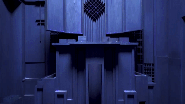 玻璃制成的裝置的地板、墻壁和天花板有機(jī)浮雕和散布著的骨頭似的圖案對(duì)稱性和和諧性在這里完美呈現(xiàn)并反映著圣所的圣潔