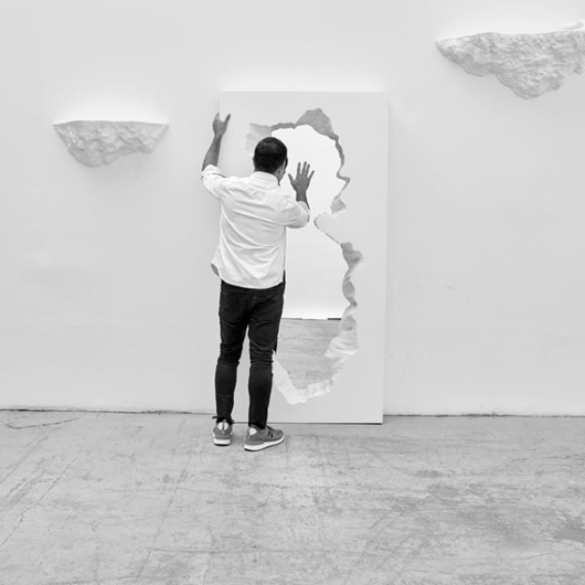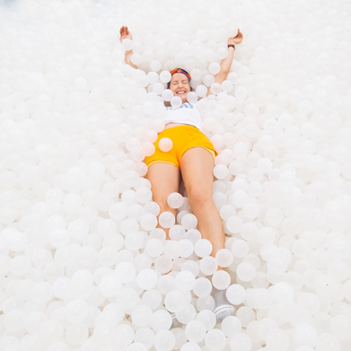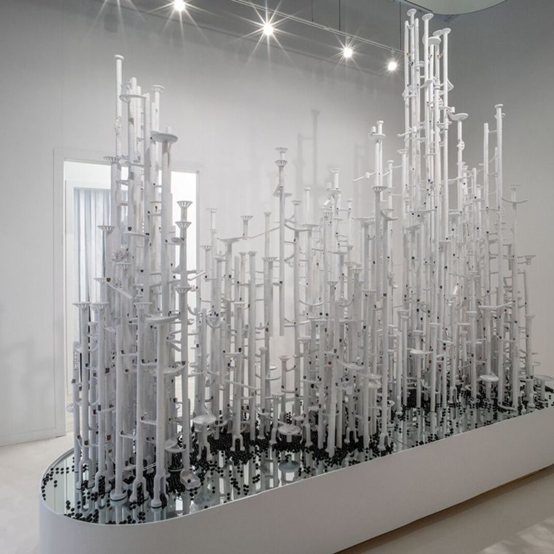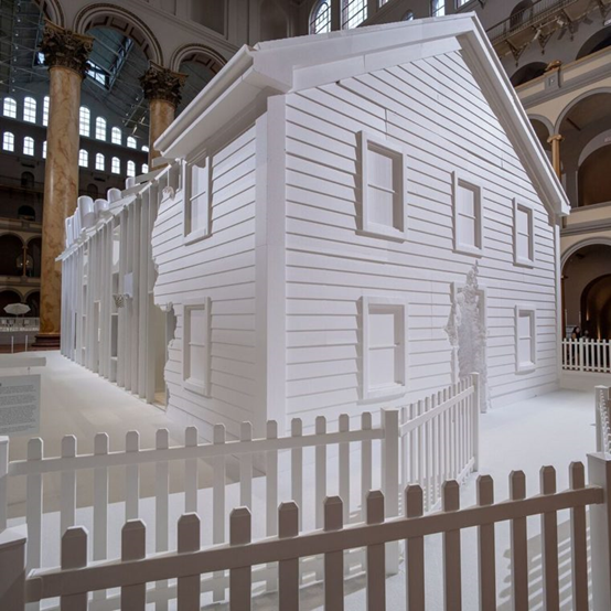 在博物館的西院,或者說(shuō) "前院",一個(gè)定制的再現(xiàn)《紀(jì)念鞠躬》(2012年),歡迎游客進(jìn)入空間。參觀者從房子里出來(lái)走向東庭,或 "后院",迎接他們的是《Playhouse》(2017年)和一個(gè)裝滿數(shù)十萬(wàn)個(gè)可回收塑料球的腎形泳池,讓人想起《The BEACH》(2015-17年)。