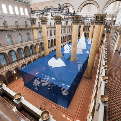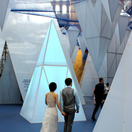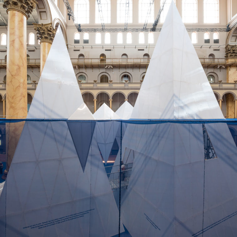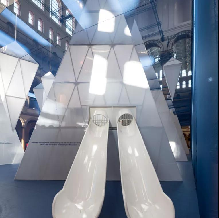 冰河由可重復(fù)使用的建筑材料建造,如腳手架、聚碳酸酯板等材料。6米高的"水位線 "可以從高處俯瞰海面,也可以將下面高聳的"貝格"之間的景色盡收眼底。最高的 "貝格 "為17米,可直接到達(dá)博物館的三層陽(yáng)臺(tái)。