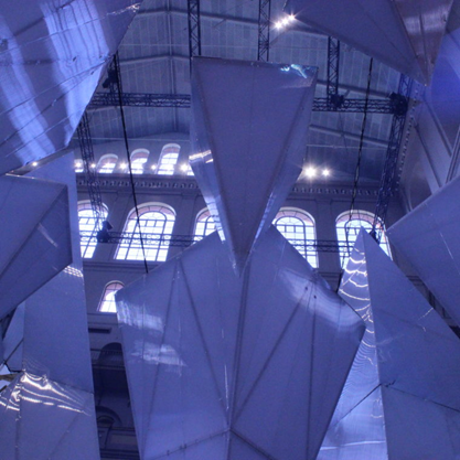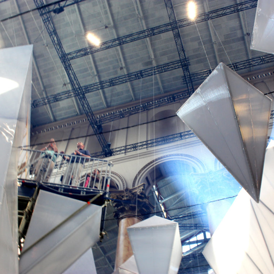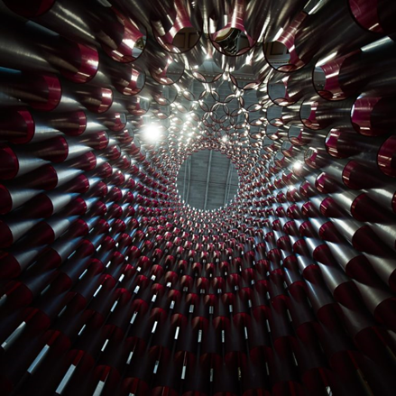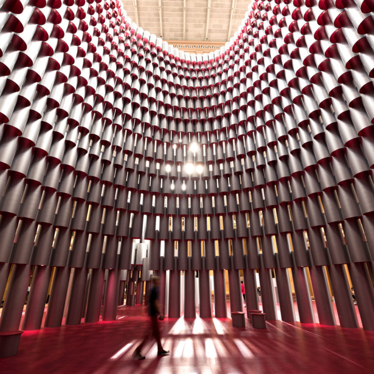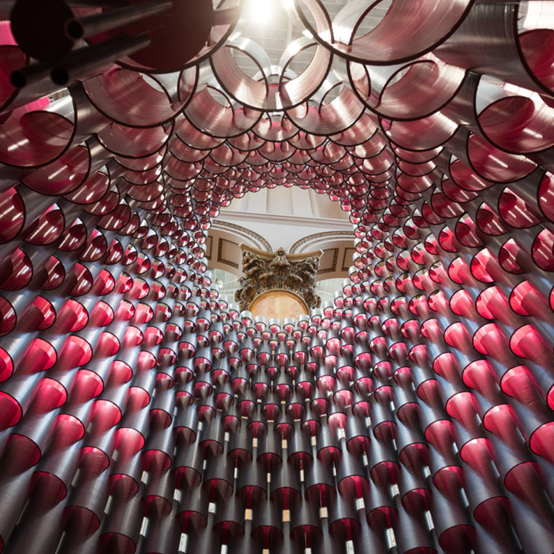 該裝置最高的圓頂高達(dá)18.29米,其特點(diǎn)是直徑超過(guò)3米的圓環(huán)。這些管子的特點(diǎn)是反射銀色的外部和鮮艷的洋紅色內(nèi)部,與博物館19世紀(jì)歷史悠久的內(nèi)部和巨大的科林斯柱形成鮮明的視覺對(duì)比。