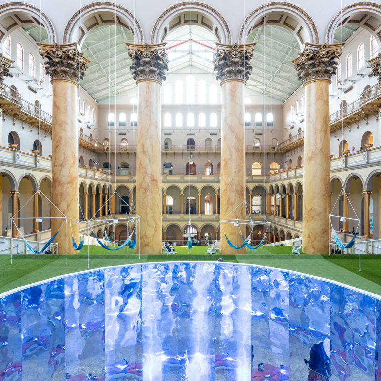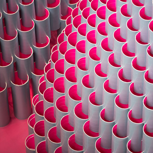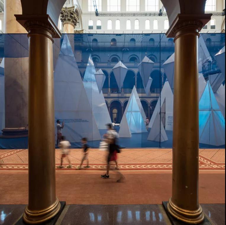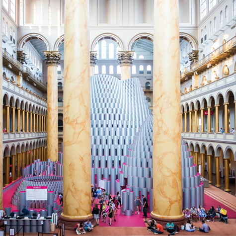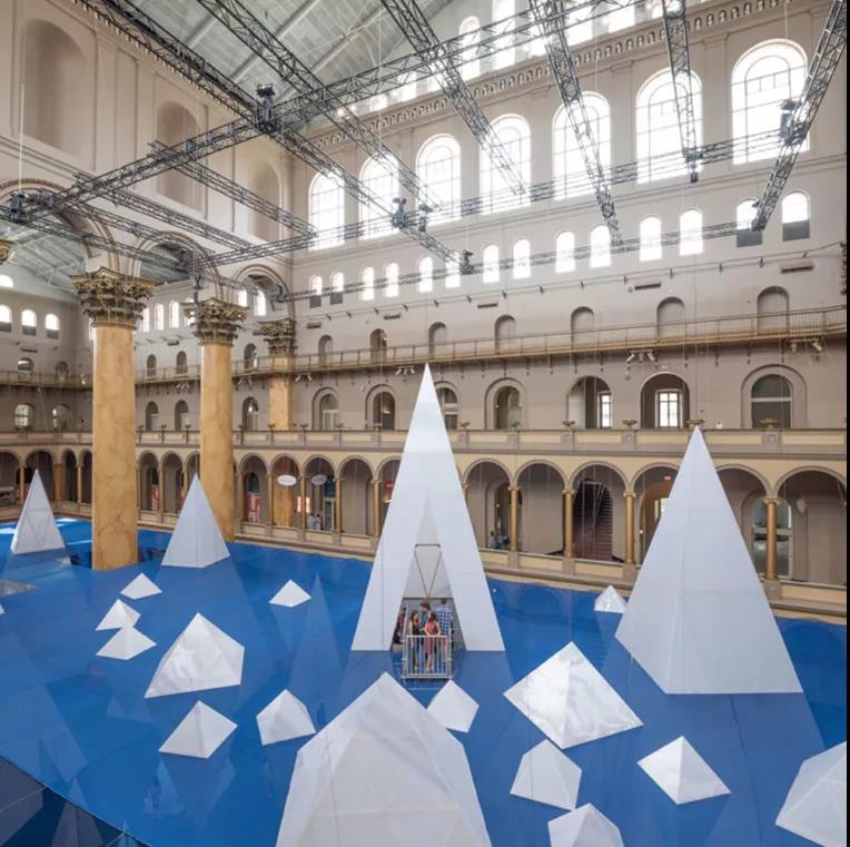 國(guó)家建筑博物館和Studio Gang在大禮堂推出最新的夏日街區(qū)派對(duì)裝置 "蜂巢"。蜂巢高聳在博物館的最上層,由2700多根纏繞的紙管搭建而成,這種建筑材料是可回收、輕質(zhì)和可再生的。這些紙管的尺寸從10到25厘米不等,并相互交錯(cuò),形成三個(gè)動(dòng)態(tài)的相互連接的圓頂房間。