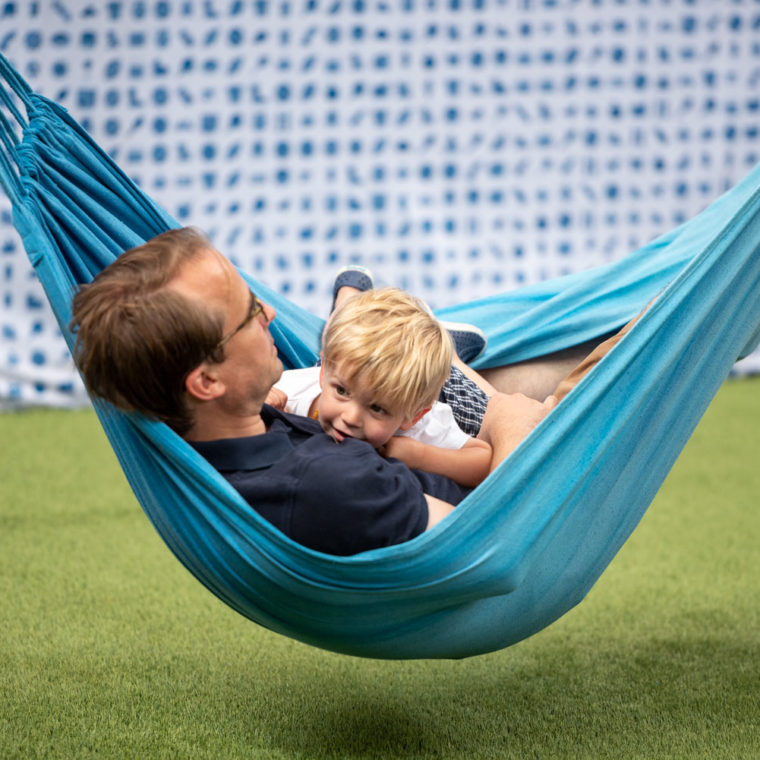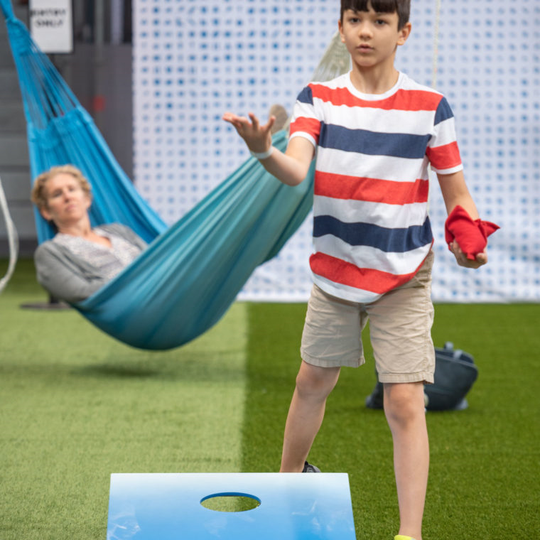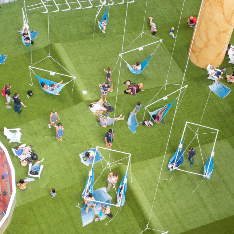 休息區(qū)的中心是懸掛在30米高的天花板網(wǎng)格上的互動(dòng)吊床。吊床內(nèi)有隱藏的揚(yáng)聲器,程序化地播放美國(guó)著名故事家的音頻,分享夏日的記憶。