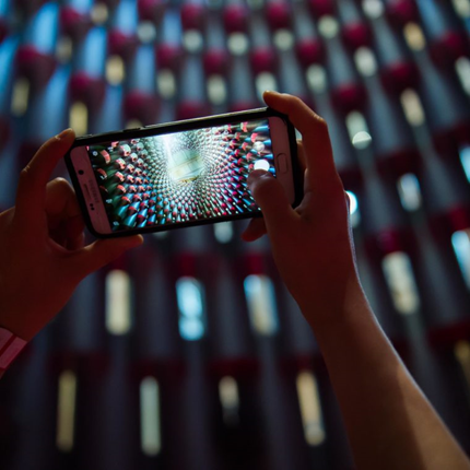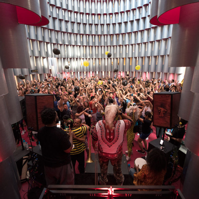 每個(gè)房間都有獨(dú)特的聲學(xué)特性,將影響樂器的音色、混響、反射以及參觀者的感知。大型主廳的頂部是一個(gè)高聳的穹頂,它過(guò)濾了大禮堂的自然光,并在空間中創(chuàng)造了復(fù)雜的光影圖案。在裝置外,費(fèi)城的設(shè)計(jì)教育家Alex Gilliam的缺口紙板 "Build It! ”圓盤提供了一個(gè)動(dòng)手的合作建造活動(dòng)。讓游覽者充分參與其中。