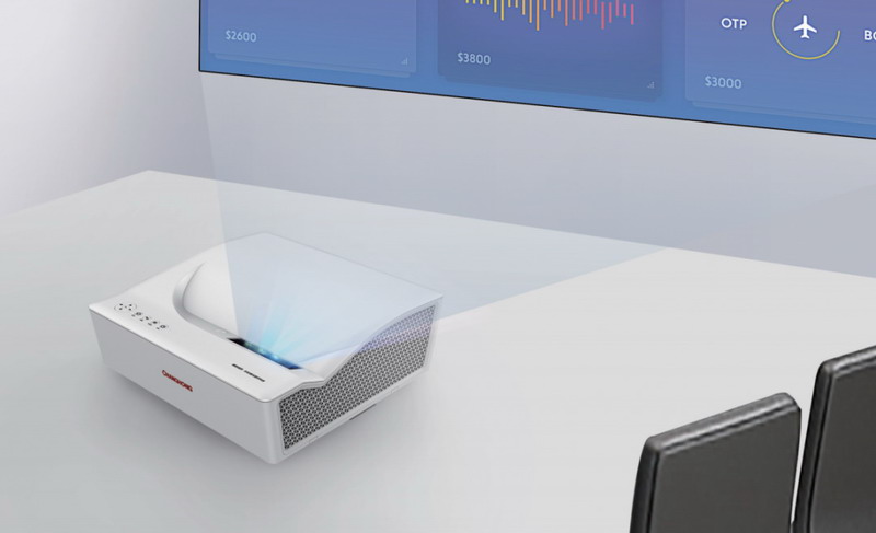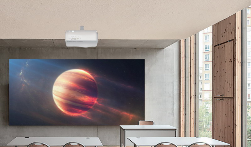 長虹激光電視商教系列為超短焦激光電視,離墻50厘米就能投射100吋畫面,更省空間,也不會(huì)因?yàn)殚L焦投影而照射老師或會(huì)議演講者的眼睛。