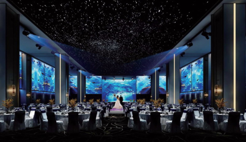 在某酒店的全息宴會(huì)廳,長虹工程激光電視讓宴會(huì)廳的墻壁可以根據(jù)宴會(huì)主題切換裝飾場景,流光溢彩,光影燦然。這樣,不僅可以更靈活地滿足顧客對(duì)宴會(huì)氛圍的需求,還能為顧客節(jié)省布置成本,讓酒店吸引更多的顧客預(yù)定使用。