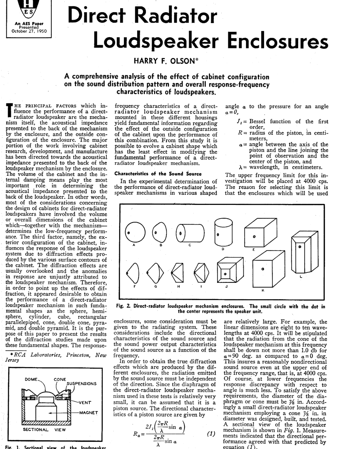 回溯到1930年代一系列的古典電音實(shí)驗(yàn),Harry Olsen博士將全音域單元,放置于大小相近、形狀不同的木箱中,他清楚的展示,當(dāng)音箱外型為大球體時(shí),能有最流暢的響應(yīng),且表示最糟形狀的其中一種為方形角柱。