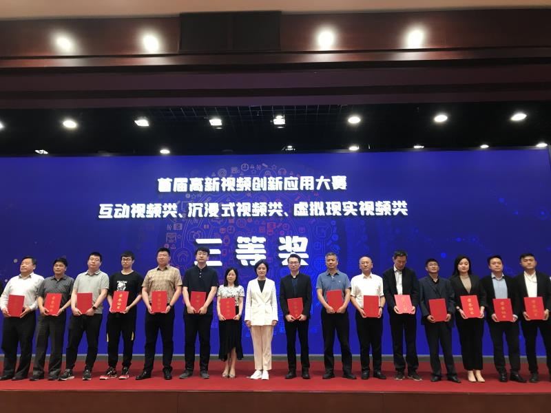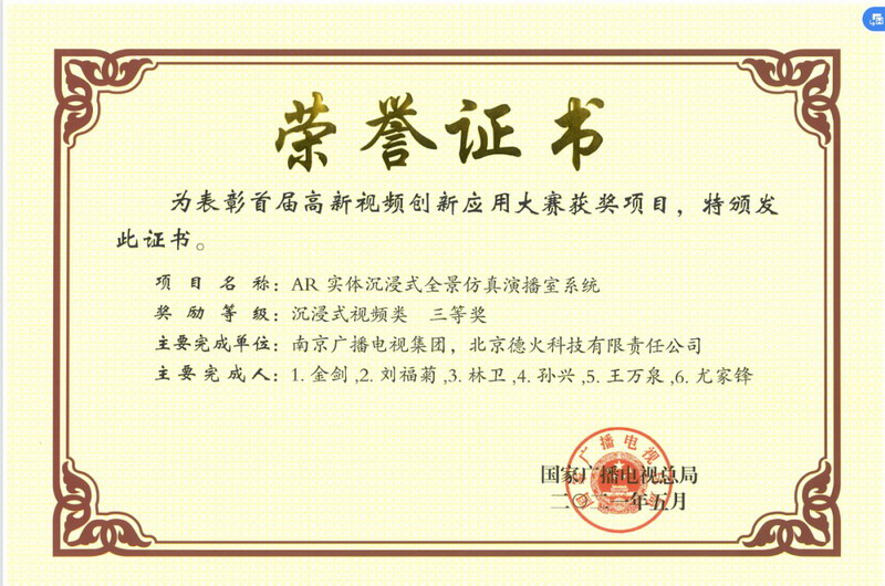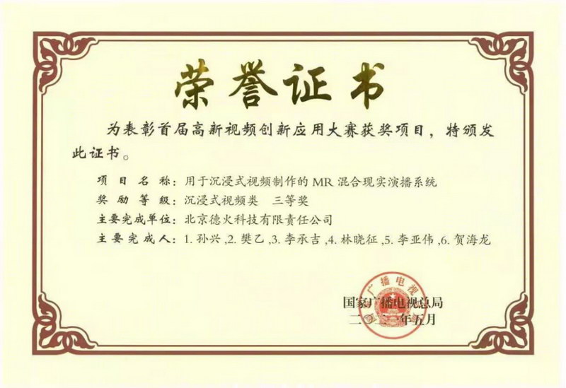當(dāng)日主題報告會上,首屆高新視頻創(chuàng)新應(yīng)用大賽頒獎儀式在北京國際會議中心隆重舉行。經(jīng)過專家組委會層層篩選,千家企業(yè)強強角逐,北京德火科技、南京廣播電臺&北京德火科技通過5G應(yīng)用、技術(shù)演示、效果呈現(xiàn)等多方面優(yōu)異表現(xiàn),經(jīng)過多番評審,最終憑借《沉浸式視頻制作的MR混合現(xiàn)實演播系統(tǒng)》、《AR實體沉浸式全景仿真演播室系統(tǒng)》獲得沉浸式視頻類三等獎。