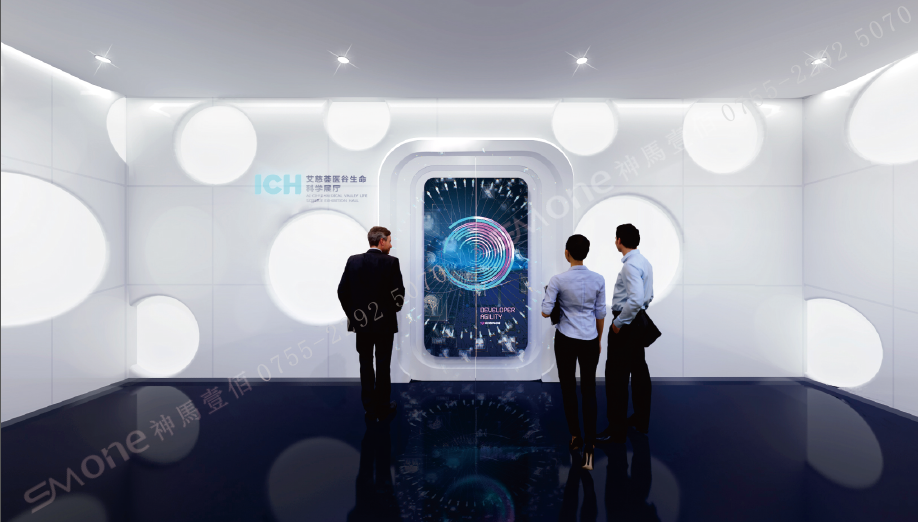 神馬壹佰此次策展站在時(shí)間的視角,以時(shí)光為線索,細(xì)胞為單位探索生命的歷程。入口加入光感智門,參觀者將手掌放上的感應(yīng)識(shí)別區(qū)域,大門產(chǎn)生光電反應(yīng)并緩緩打開,開啟展廳的參觀,在空間上起到了分隔作用,增強(qiáng)參觀儀式感。