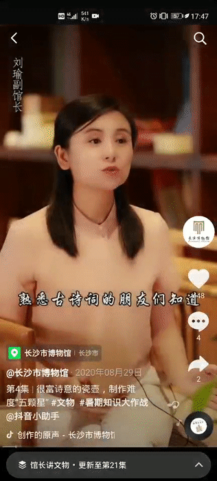 長博抖音2020年共推發(fā)了3個不同主題的系列視頻,分別是“館長講文物系列”、“長沙文化地理系列”和“長沙文物故事系列”。
