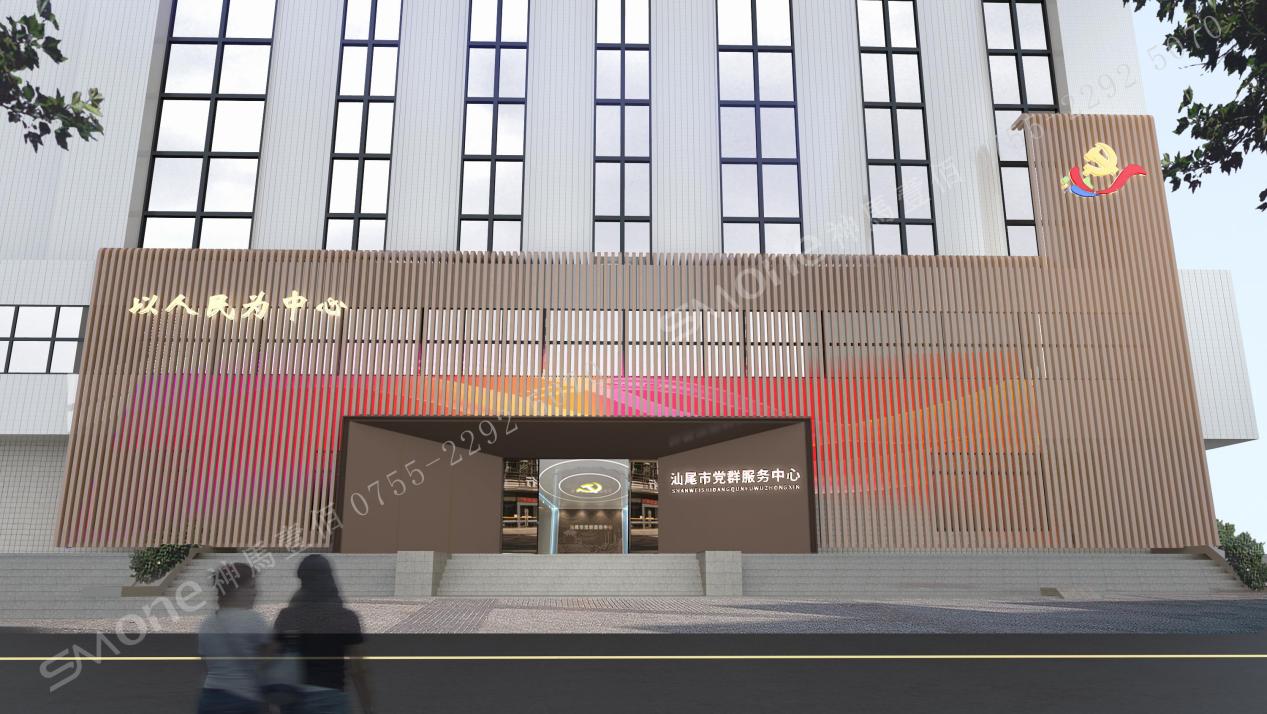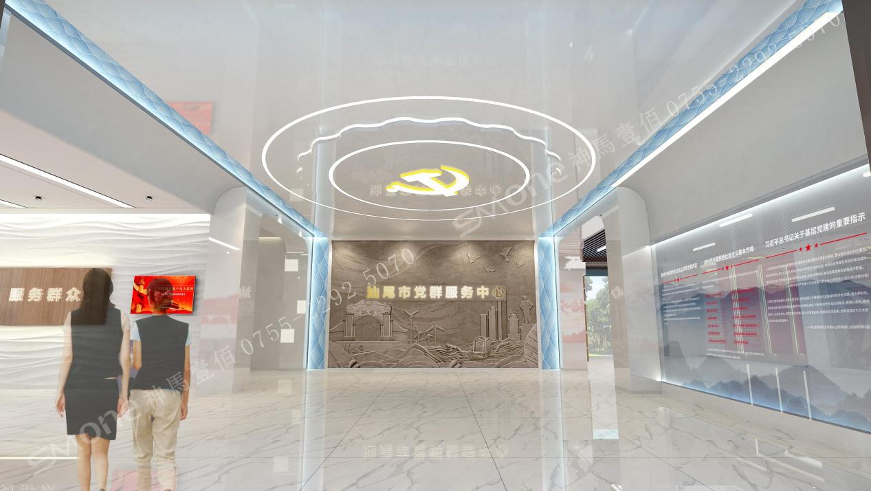 服務(wù)中心頂部黨徽造型,天花板黨徽燈帶環(huán)繞,象征黨的光輝照耀、 指引汕尾的建設(shè)發(fā)展,整個大廳給人以大氣、莊重的印象,又具獨特汕尾特色。