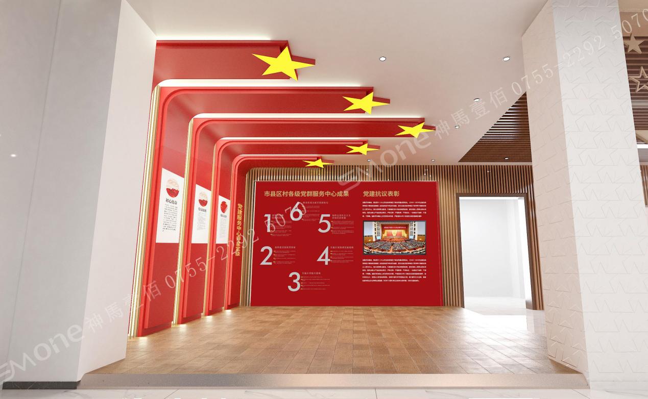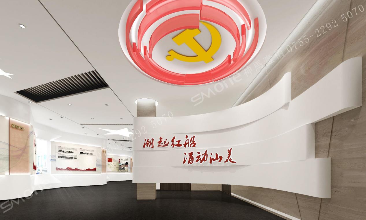 海陸豐革命史及汕尾黨建工作展示區(qū),形象墻及黨徽整體以海浪形式為造型,切合主題——潮起紅船 涌動汕美;