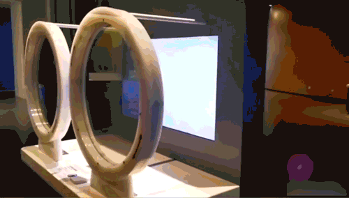 從遠(yuǎn)處看,它是一個(gè)白色的照明屏幕。走近顯示器,觀眾通過使用“Oto Megane”觀察白色屏幕,可以收到相應(yīng)的聲音源,和彩色圖案例。如“聲波”、“發(fā)出聲音的動(dòng)作”和“發(fā)出聲音的場景。