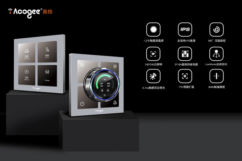 X系列旋鈕內(nèi)嵌1.3寸觸摸液晶屏,高清全視角240*240分辨率,分布式每單聯(lián)各集成3路16A磁保持負(fù)載,強(qiáng)大穩(wěn)定LonWorks總線保證,0.1ms毫秒級(jí)觸感背光感應(yīng),極致8mm貼墻厚度,優(yōu)雅之上,極富魅力。
