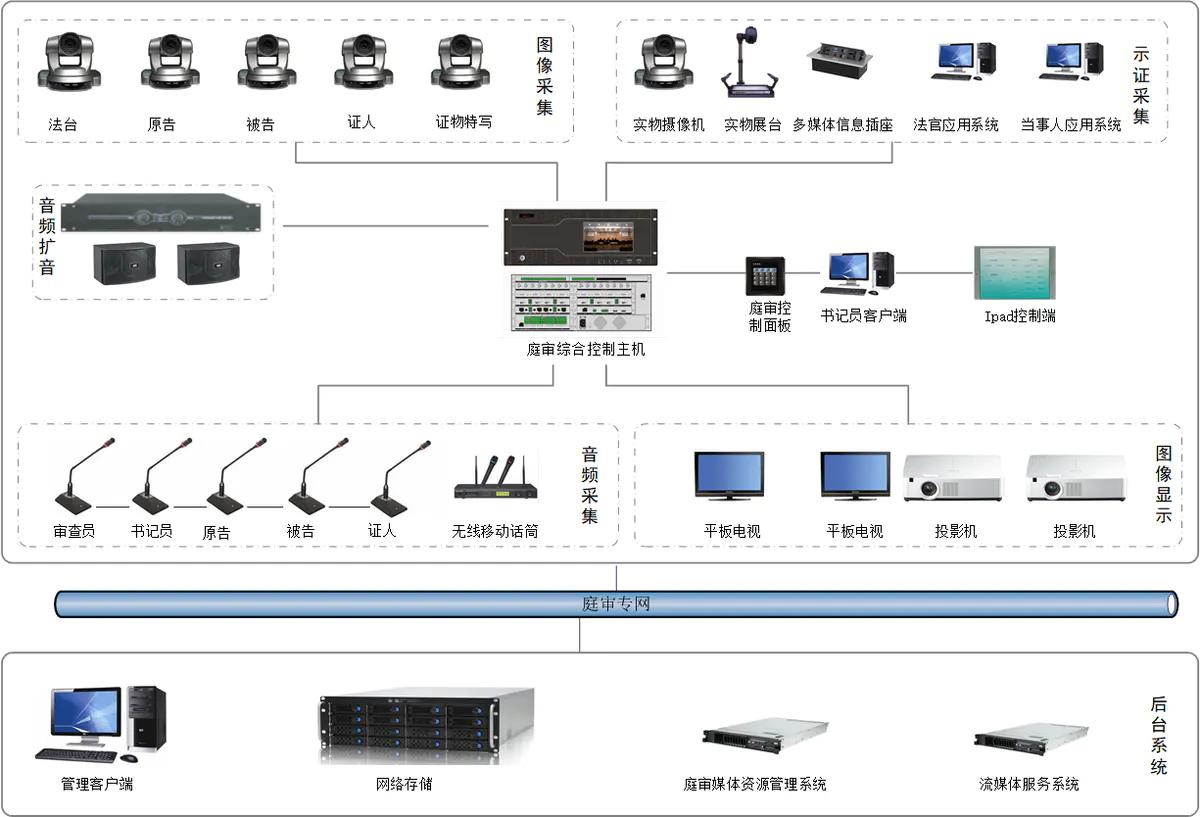 模擬法庭多媒體審理系統(tǒng)則是利用了網(wǎng)絡(luò)技術(shù)、先進(jìn)的多媒體技術(shù)以及集中控制技術(shù),實(shí)現(xiàn)審理過程中的實(shí)況采集、證據(jù)公開展示、筆錄校對(duì)、審理直播,并對(duì)審理庭內(nèi)部聲、光、電等各種設(shè)備進(jìn)行集中自動(dòng)化控制,提供審理信息化的強(qiáng)大應(yīng)用。