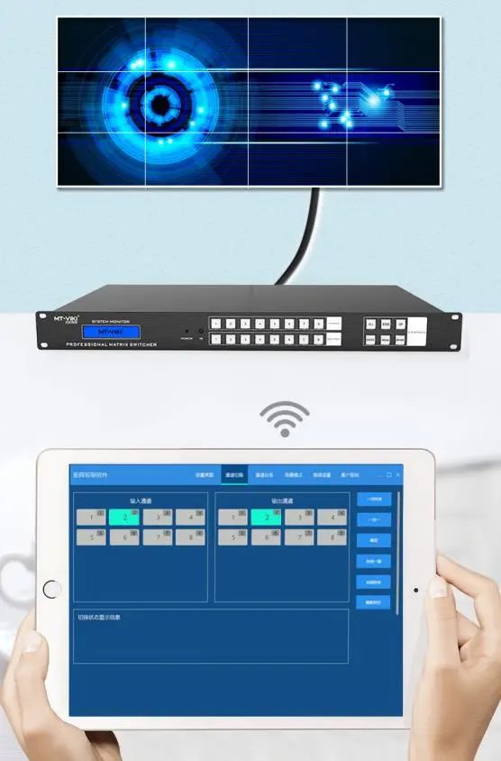 此外,很多場(chǎng)所中都要用到矩陣切換器,他的作用就是將一條線路或者多條線路的音視頻信號(hào)分別輸送到一個(gè)或者多個(gè)音頻顯示設(shè)備上。