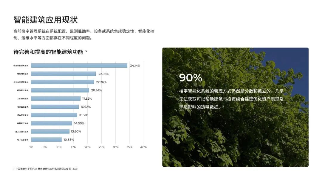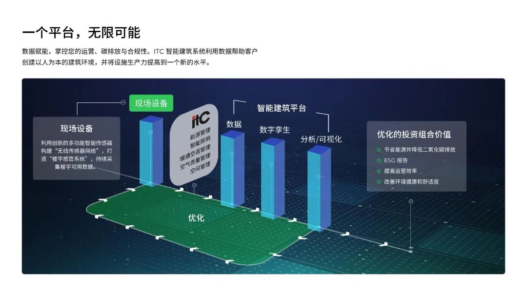 報(bào)告提到90%的碳排放來(lái)自建筑運(yùn)營(yíng),其中耗電量占全球耗電量55%;當(dāng)前樓宇管理系統(tǒng)在系統(tǒng)配置、監(jiān)測(cè)準(zhǔn)確率、設(shè)備或系統(tǒng)集成穩(wěn)定性、智能化控制、運(yùn)維水平等方面都存在不同程度的問(wèn)題。為改變這一現(xiàn)狀,itc開(kāi)發(fā)出一系列的創(chuàng)新技術(shù)來(lái)構(gòu)建可靠的智能建筑基礎(chǔ)設(shè)施,通過(guò)現(xiàn)場(chǎng)設(shè)備、應(yīng)用模塊及具有強(qiáng)大分析和可視化的智能建筑平臺(tái),為建筑運(yùn)營(yíng)核心領(lǐng)域帶來(lái)全新效率,對(duì)樓宇進(jìn)行持續(xù)優(yōu)化,實(shí)現(xiàn)最佳的運(yùn)營(yíng)性能。