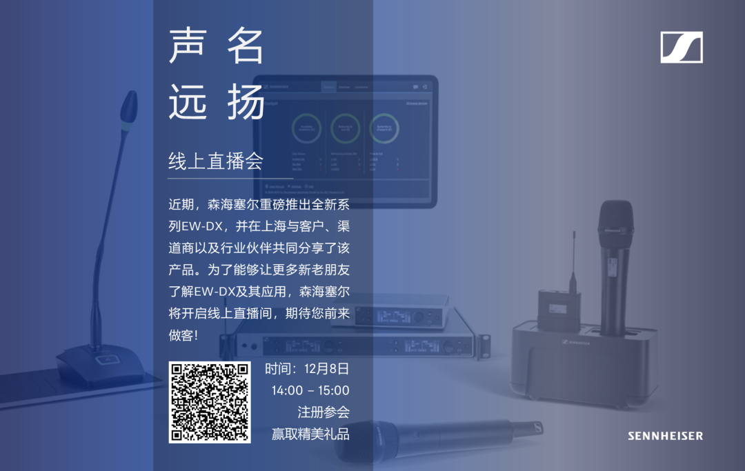今年9月,森海塞爾商務(wù)通訊舉辦線下EW-DX產(chǎn)品發(fā)布會(huì),與客戶、渠道商以及行業(yè)合作伙伴共同分享EW系列新品,取得良好反響。疫情期間,為能夠讓更多伙伴了解EW-DX的特點(diǎn)和應(yīng)用,森海塞爾將線下巡展轉(zhuǎn)為線上直播間,期待您前來(lái)做客。