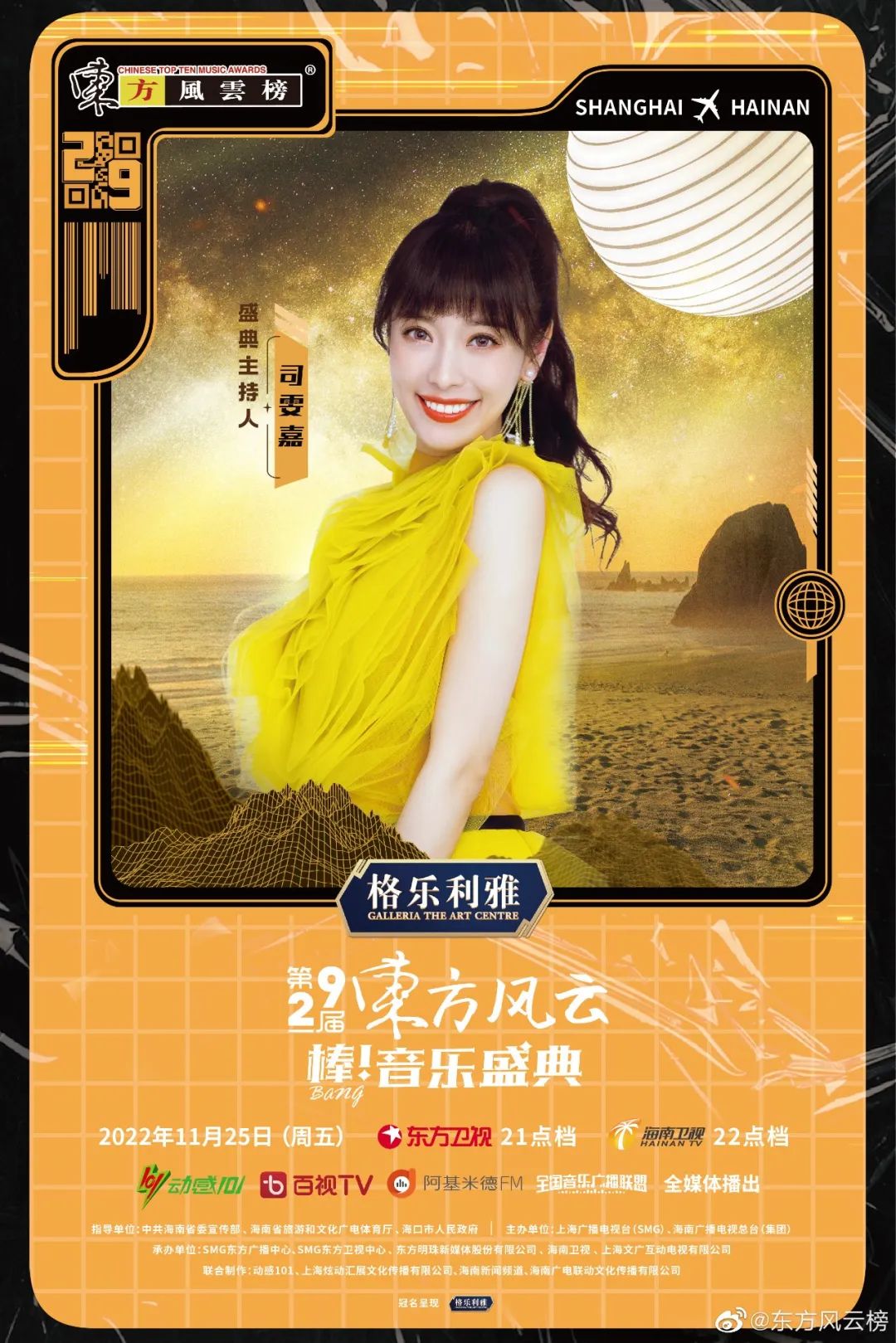 11月25日晚,格樂利雅·第29屆《東方風云榜》音樂盛典在海口市海口灣美源碼頭廣場舉辦,這是《東方風云榜》系列活動自1993年創(chuàng)立以來首次走出上海。本屆《東方風云榜》音樂盛典盤點了2021年度華語樂壇的成績單,G.E.M.鄧紫棋、GAI周延、黃齡、周深、鄭云龍等眾多歌手出席并登臺演出,現(xiàn)場是通過東方衛(wèi)視、海南衛(wèi)視、百視TV、動感101、阿基米德FM及全國音樂廣播聯(lián)盟三十余家電臺向全球播出。