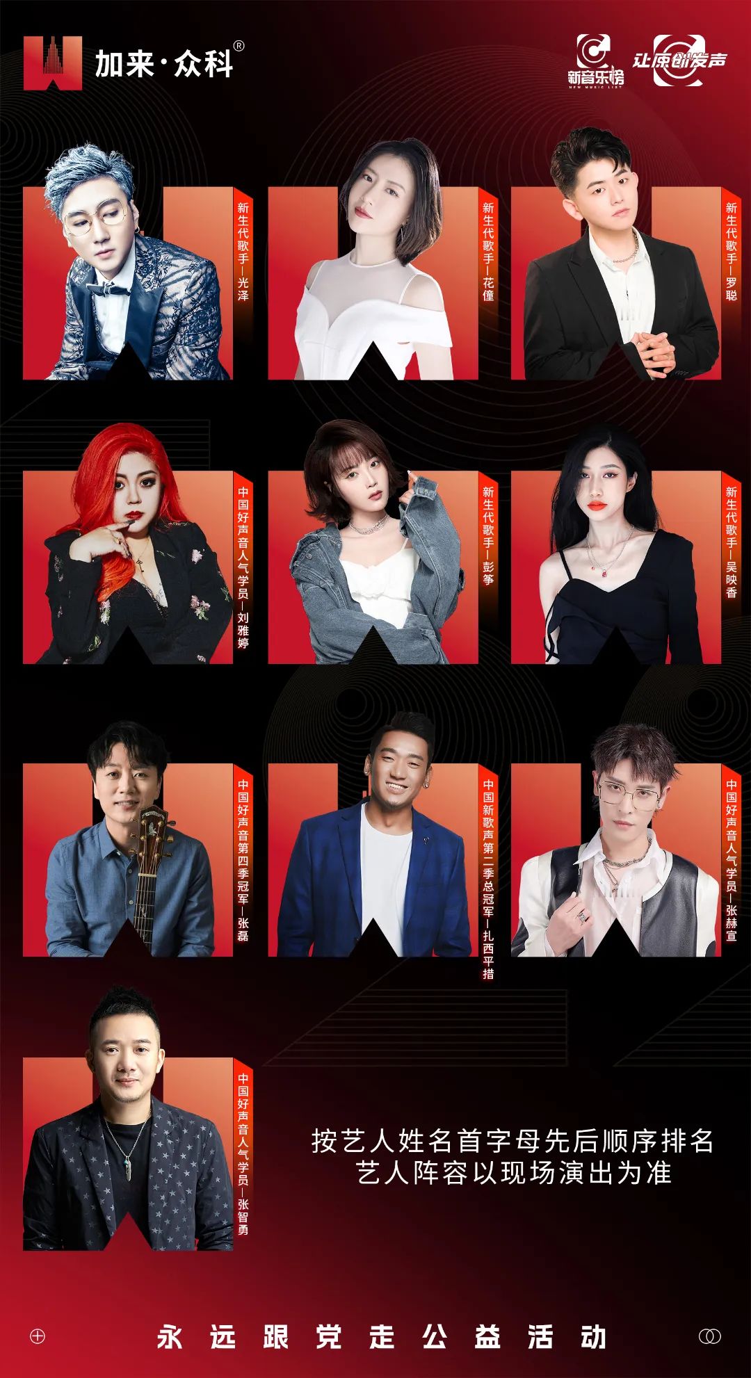 本次官宣超豪華藝人陣容引起廣泛關注,包括新生代歌手光澤、新生代歌手花僮、新生代歌手羅聰、中國好聲音人氣學員劉雅婷、新生代歌手彭箏、新生代歌手吳映香、中國好聲音第四季冠軍張磊、中國新歌聲第二季總冠軍扎西平措、中國好聲音人氣學員張赫宣、中國好聲音人氣學員張智勇等眾多優(yōu)質音樂人空降現場,從視聽感官到現場體驗,不限風格,盡情玩轉音樂。(按藝人姓名首字母先后順序排名,藝人陣容以現場演出為準)