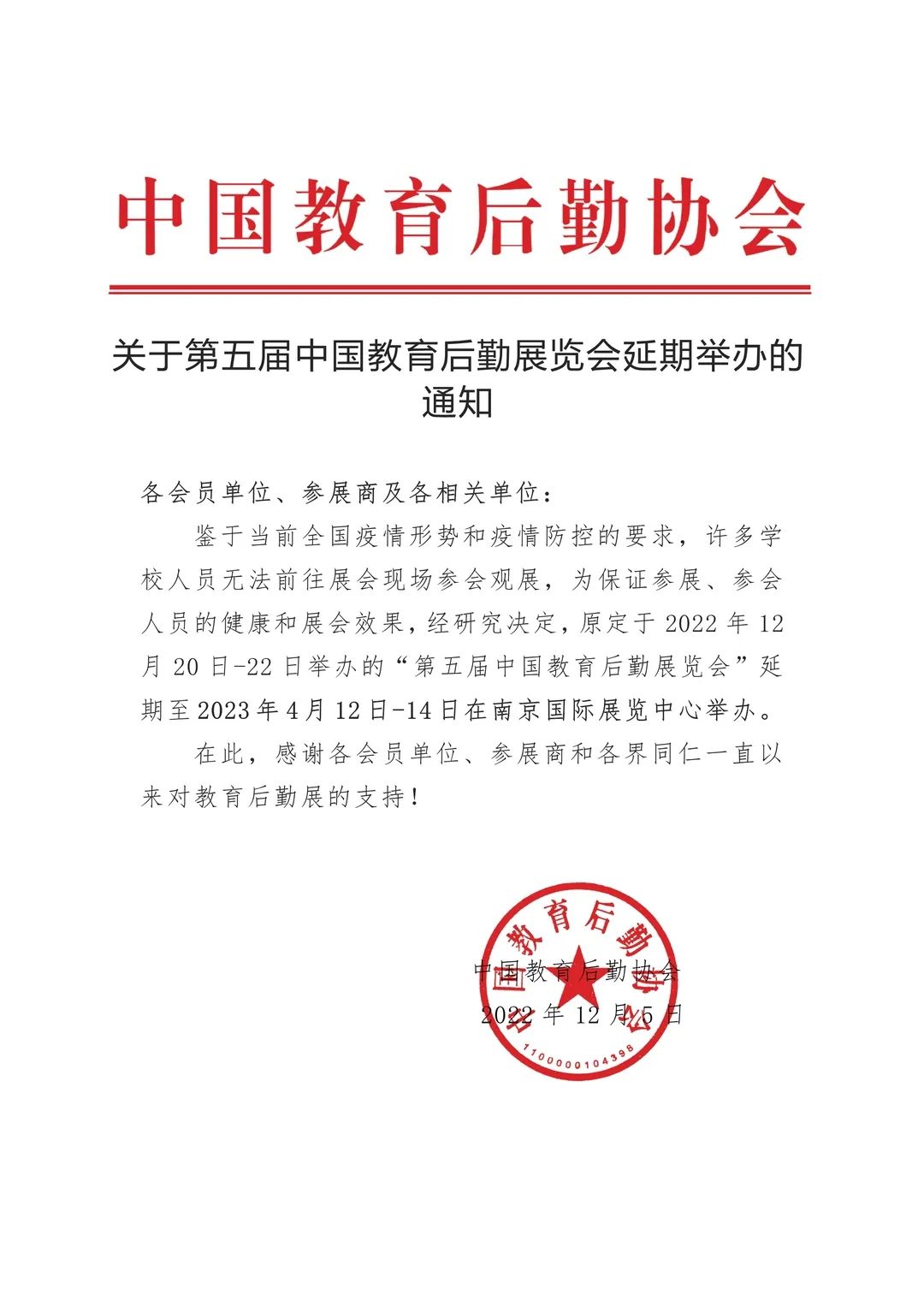 鑒于當前全國疫情形勢和疫情防控的要求,許多學校人員無法前往展會現(xiàn)場參會觀展,為保證參展、參會人員的健康和展會效果,經(jīng)研究決定,原定于2022年12月20日-22日舉辦的“第五屆中國教育后勤展覽會”延期至2023年4月12日-14日在南京國際展覽中心舉辦。