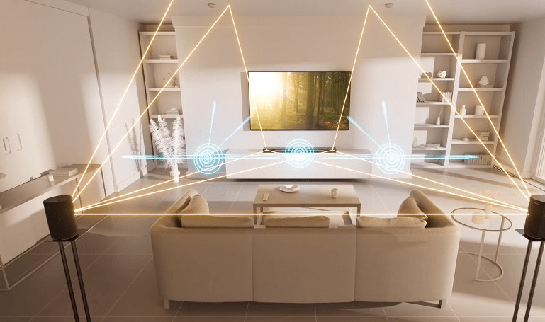 360SSM技術(shù)首先通過(guò)內(nèi)置麥克風(fēng)測(cè)量回音壁和后環(huán)繞音箱的相對(duì)高度和位置,并根據(jù)房間布局自動(dòng)優(yōu)化聲音;再基于位置信息合成聲波來(lái)創(chuàng)建多個(gè)真實(shí)發(fā)聲的幻像揚(yáng)聲器,發(fā)出球狀聲波,構(gòu)建出比實(shí)體揚(yáng)聲器范圍更寬廣的聲場(chǎng),打造全方位環(huán)繞、極具沉浸感的聆聽(tīng)效果。用戶使用產(chǎn)品時(shí),不用再受傳統(tǒng)家影精確擺放位置和繁瑣布線的困擾,通過(guò)輕松靈活地?cái)[放,就能打造出對(duì)自己家庭環(huán)境來(lái)說(shuō)理想的穹頂式全方位廣域環(huán)繞聲場(chǎng)。