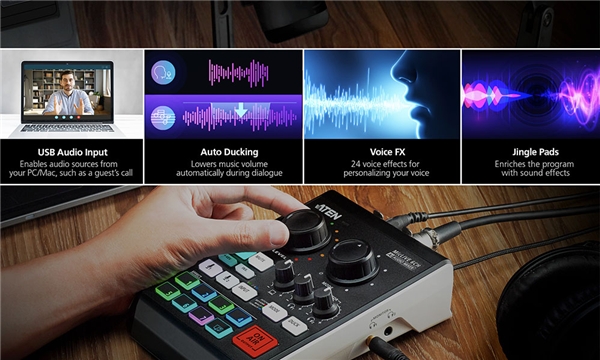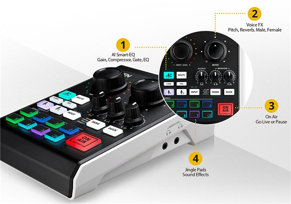 MicLIVE™ 是業(yè)界首款人工智能實(shí)時(shí)人聲頻段優(yōu)化的混音器,集成了 USB 音頻接口、語(yǔ)音效果處理器和音效墊。它通過(guò)其 AI Smart-EQ 采用聲學(xué)增強(qiáng)來(lái)解決常見(jiàn)的錄音問(wèn)題并優(yōu)化錄音體驗(yàn)以簡(jiǎn)化播主編輯制作。